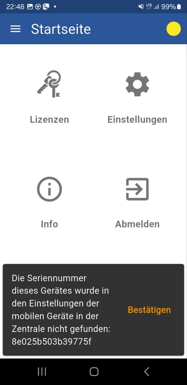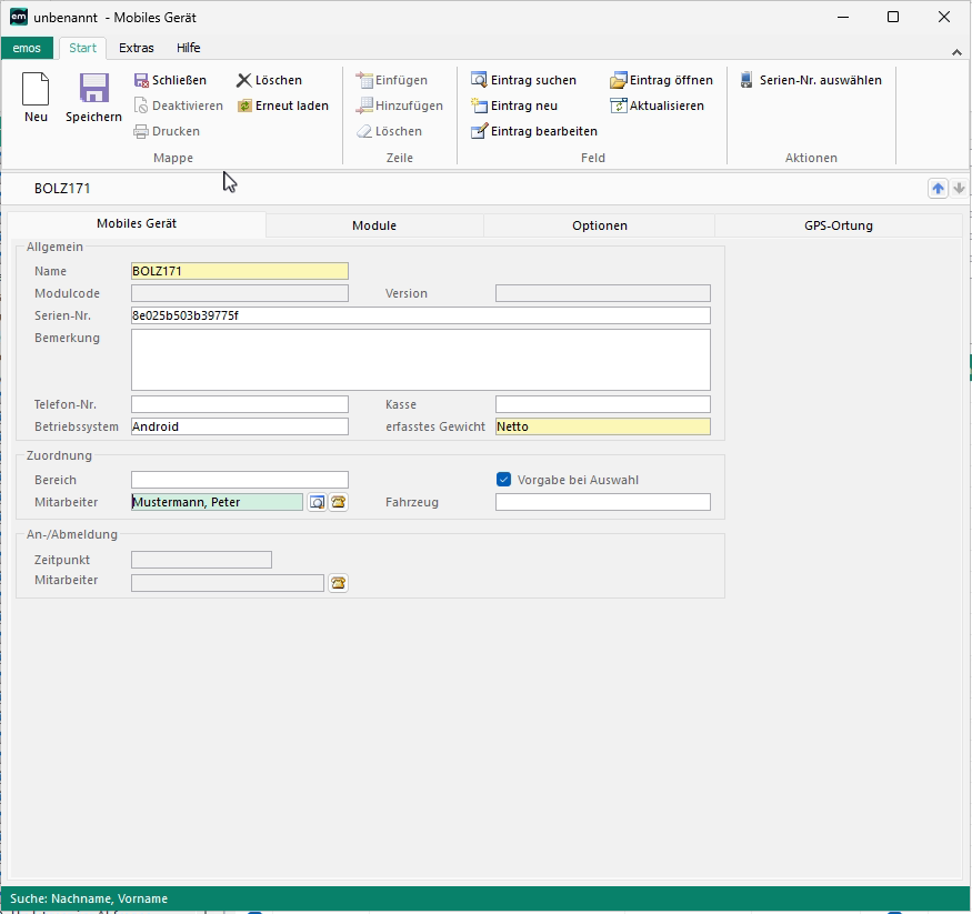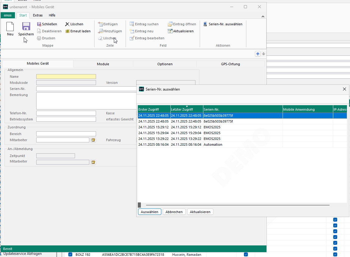 In der Eingabemaske für ein neues Mobilgerät gibt es oben rechts in der Menüleist die Option "Serien-Nr. auswählen". Diese anklicken und das Gerät mit der im letzten Schritt gemerkten Seriennummer auswählen: