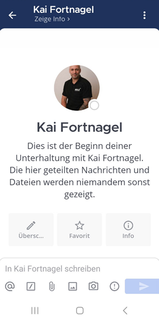 Klickt ihr auf eine Person öffnet sich das Gespräch und ihr seht diesen Bildschirm mit dem Namen der Person der ihr schreiben möchtet.