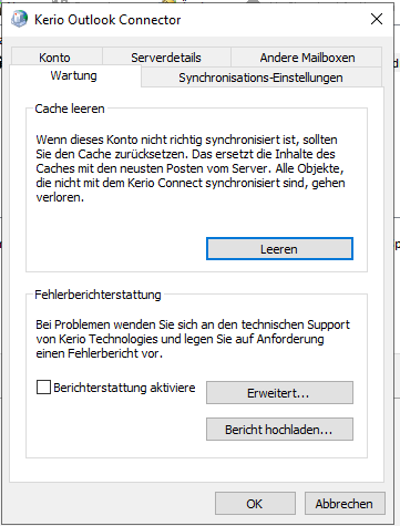 Um Outlook neu mit dem Kerio Server zu synchronisieren, kann man den Cache (zwischengespeicherte Daten) löschen. Danach synchronisiert Outlook einmal alle Emails neu vom Server.